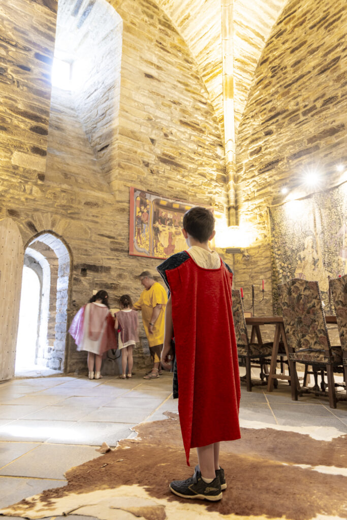 Dans les salles meublées de cette forteresse, la vie du Moyen Âge devient plus qu’imaginable, en costumes attablé dans la grande salle seigneuriale ou posé sur les coussièges et lits à baldaquin des chambres des étages …