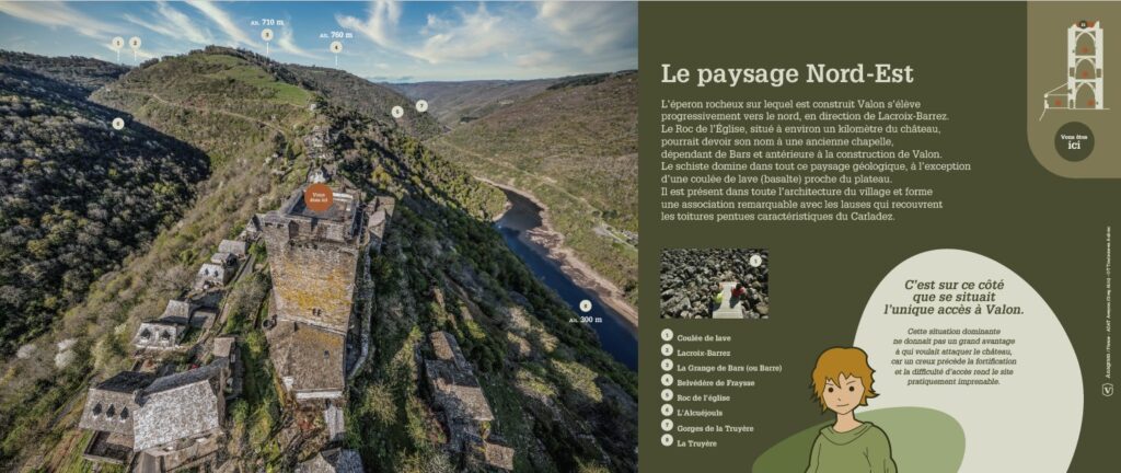 – au Belvédère du village de Fraysse. Depuis Valon, cette coulée de lave est bien visible, elle apparaît en inversion de relief au nord-ouest.
