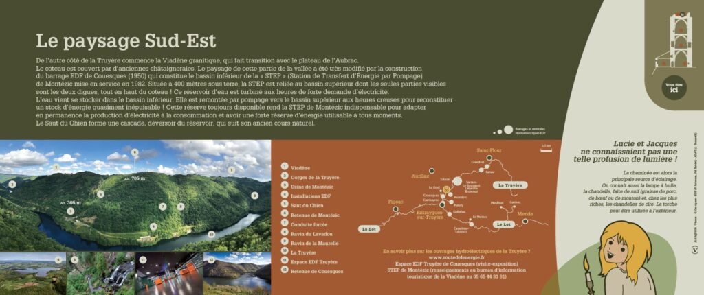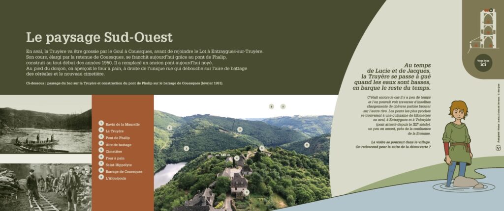 Aujourd’hui, sont visibles les traces de ces coultades en remontant vers les volcans d’Auvergne et de part et d’autre de l’arrête rocheuse. L’aménagement et le balisage du sentier de découverte et de ses terrasses plongeant vers la Truyère vous raconte l’agriculture d’autrefois.